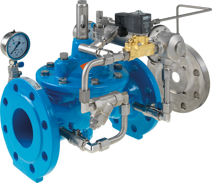 The flow control / limiting valve limits a preset max. flow from a higher pressure zone to a lower pressure zone, independent of varying operating pressures. The nominal flow is infinitely adjustable via the pilot valve up to +/- 15%. The electric solenoid valve controls the filling and emptying of the pilot chamber. The main valve is closed at zero current and opened when energized. To avoid water hammers, the closing rate can be adjusted via the throttle check valve.