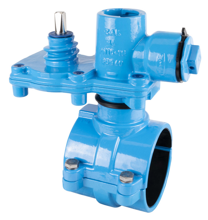 To open or close the outlet area only one half revolution (180°) is required. In combination with a drilling device (e.g. Hawle drilling device HAWLOMAT, model no. 830-00) the shut-off system permits the easy under pressure drilling of the main line.