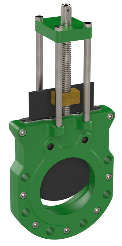 The gate valve can be installed both between two flanges, and at the end of a pipeline. Due to the hexagonal recesses for nuts, the gate valve can also be used later as an end valve, for example, in case of pipe rehabilitation. The polyurethane-coated shut-off blade of the knife gate valve seals directly at the body. When worn, the sealing package can be exchanged without dismantling the gate valve.