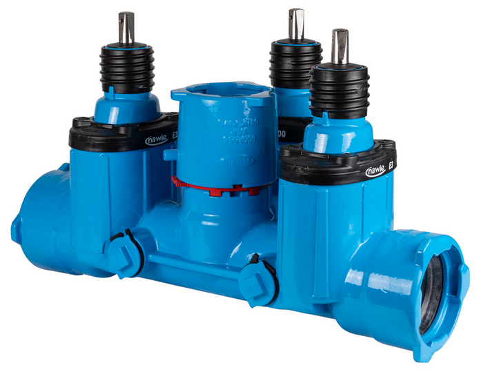 Combi III gate valve with BAIO® double function sockets at all ends for the restraint connection with BAIO® spigot ends and for connecting DCI, steel, PE and PVC pipes.