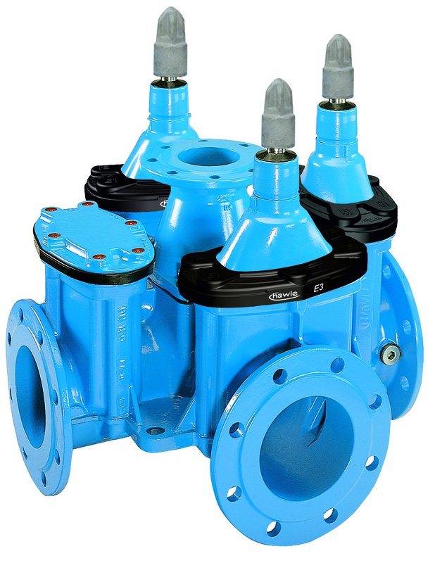 Combi-IV gate valve with flanges at all ends and vertical reducing flange. For the installation of valve junctions with up to 4 gate valves in confined space. The vertical flanged outlet serves the purpose of connecting hydrants or air valve sets.