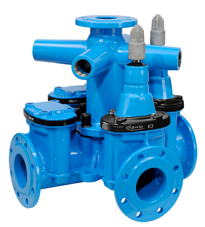 Combi-IV gate valve with flanges at all ends and double flanged taper. For the installation of valve junctions with up to 4 gate valves in confined space. The vertical outlet at the double flanged taper serves the purpose of integrating hydrants or air valve sets, the horizontal female thread outlets can be used to connect service lines.