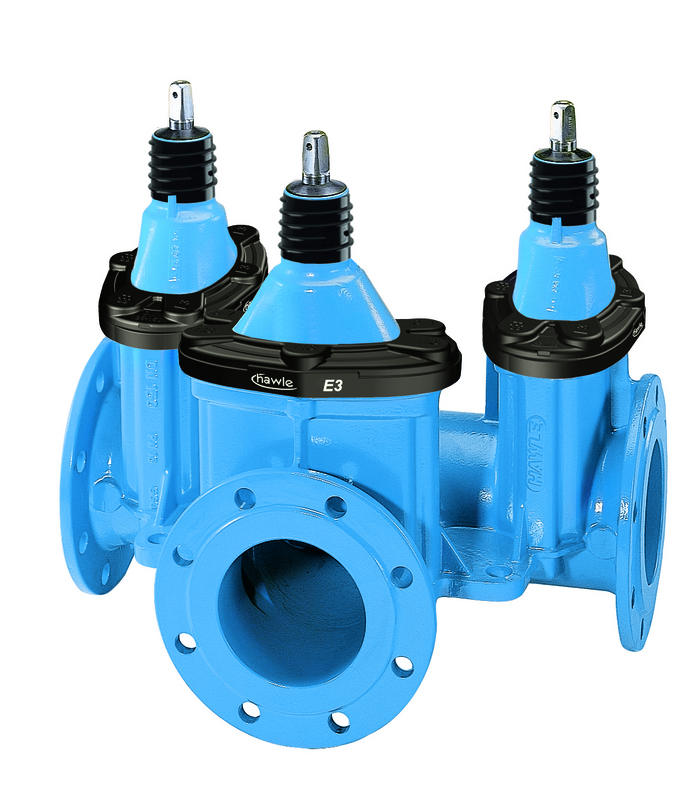 Kombi-III-zasun, prirubnički, s prirubnicama prema EN 1092-2. Za ugradnju u zasunska čvorišta s maksimalno 3 zasuna na uskom prostoru.