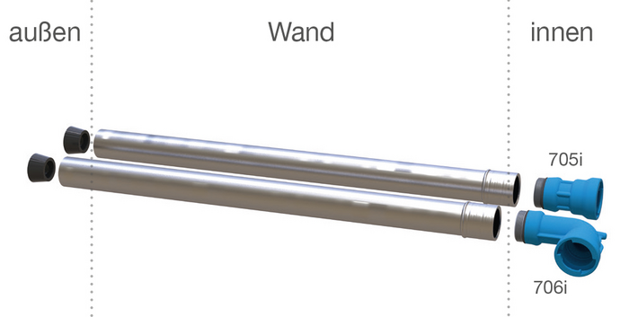 Ugradnja proboja kroz zid izvodi se uz pomoć dviju prstenastih brtvi. Prije postavljanja, potrebno je izvesti odgovarajuće bušenje jezgre na betonskom zidu. (Prstenasti pečati komora moraju biti osigurani na licu mjesta i nisu uključeni u opseg isporuke.)