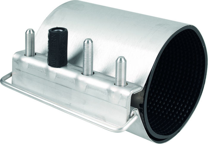 Reparaturschelle mit selbstzentrierendem Verschluss-System für Guss-, Stahl-, PVC- und AZ-Rohre.