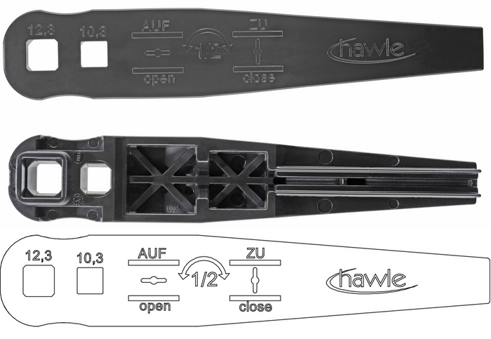Der UNI-Keilschlüssel dient vorrangig zur Betätigung von Hawle Anbohrarmaturen mit Spindelvierkant 12,3 mm (10,3 mm).