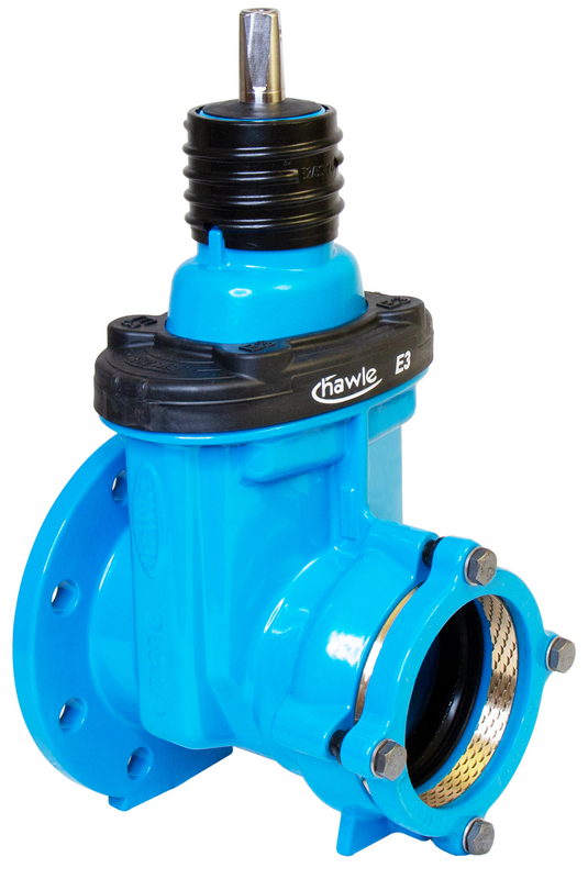 Absperrschieber, einerseits mit Flansch, andererseits mit Steckmuffe für den längskraftschlüssigen Anschluss von PE-Rohren PE 80 und PE 100 (EN 12201, DIN 8074) und PVC-Rohren (DIN EN ISO 1452-2).