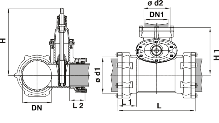 Combi-T-Schieber mit allseitiger Steckmuffe für den längskraftschlüssigen Anschluss von PE-Rohren PE 80 und PE 100 (EN 12201, DIN 8074) und PVC-Rohren (DIN EN ISO 1452-2). Platzsparender Einbau durch kompakte Bauweise sowie Einsparung an Material-, Arbeits-, Transport- u. Lagerkosten.
