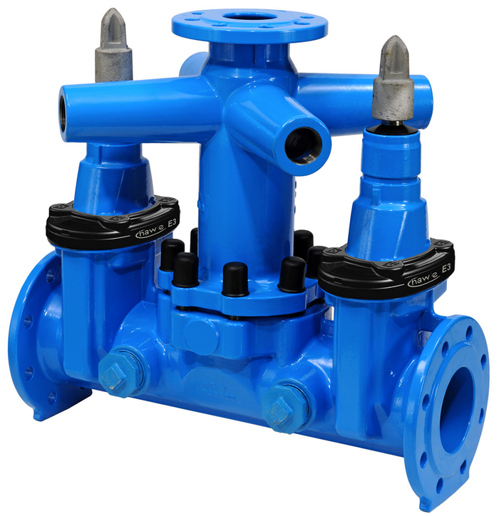 Combi-II-Schieber mit beidseitigem Flansch nach EN 1092-2 und FFR-Trommelstück. Für den Einbau von bis zu 2 Schiebern auf engstem Raum. Der vertikale Abgang am FFR-Trommelstück dient zur Einbindung von Hydranten oder Be- und Entlüftungsgarnituren, die horizontalen Innengewinde-Abgänge können für den Anschluss von Hausanschluss-Armaturen verwendet werden. Am Gehäuse befinden sich 4 weitere Innengewindeabgänge 1 1/2".