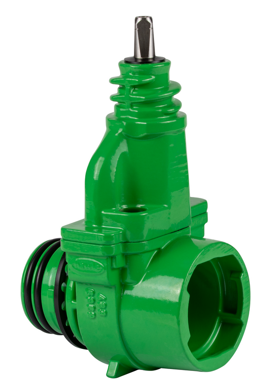 Zuverlässige und dichte Absperrfunktion durch Steckscheibe aus hartgewalztem, nichtrostendem Stahl und O-Ring-Dichtungspaket. Dichtsystem verhindert das Anbacken von Feststoffen an der Spindel und gibt die Möglichkeit das Schieberoberteil auszutauschen, ohne dass die Druckleitung außer Betrieb genommen werden muss.